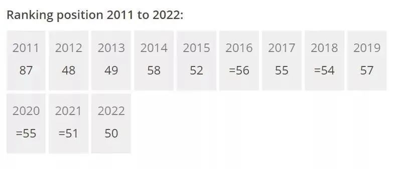 2011-2022 THE综合排名:曼大在2012年如“黑马”一样 从世界第87名直接冲到世界第48名 ,之后就基本稳定在55名左右了。