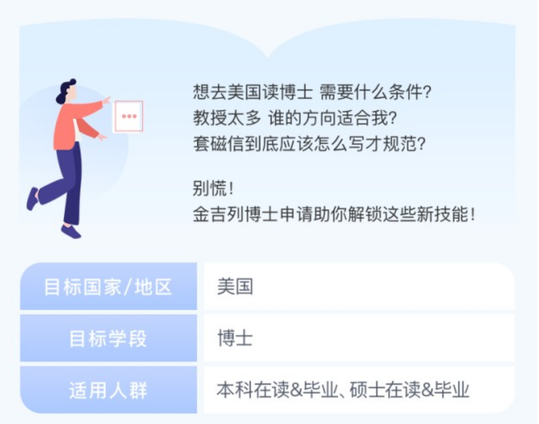 金吉列美国博士高端规划申请项目,结合金吉列留学美国博士多年申请经验,由金吉列高端规划团队长线指导,平均8年以上指导经验的尊享导师对申请层层把关。旨在根据您的个性化兴趣、课外活动以及申请前30名校需要,为您量身定制打造适合自己的服务。