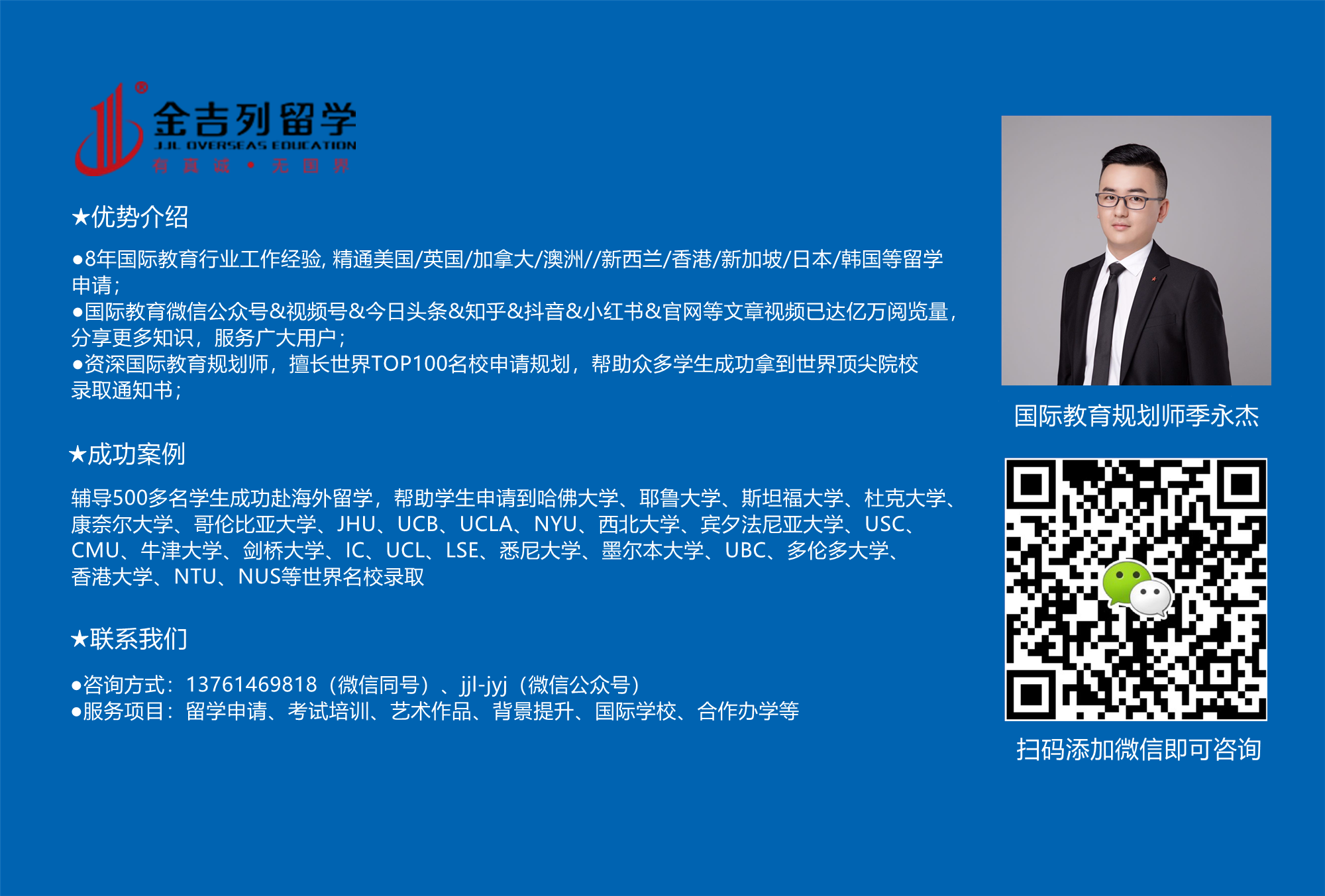 金吉列高端规划团队根据您的软硬件条件,结合您的需求和申请难度,帮助您制定专业有效的方案,大幅增加您申请的成功率和申请高端院校的机会。
