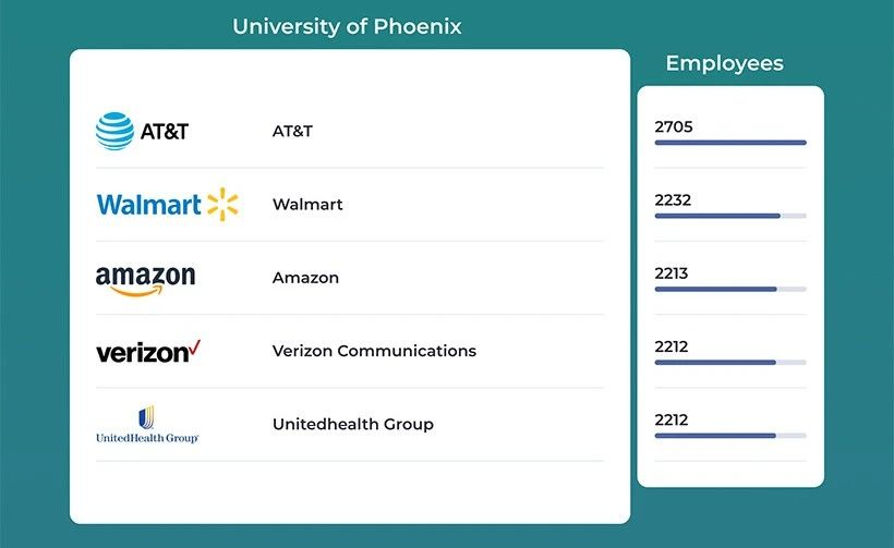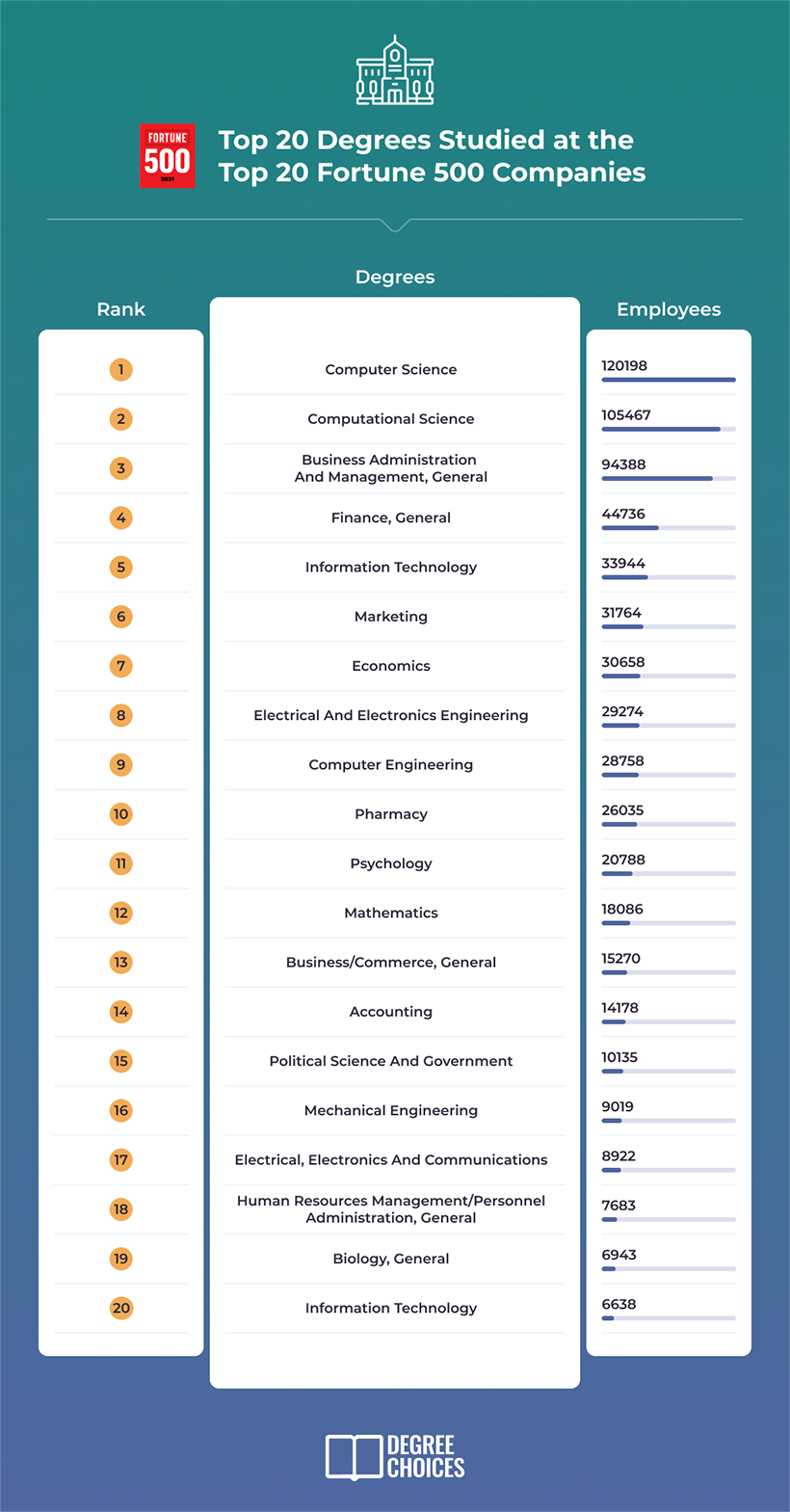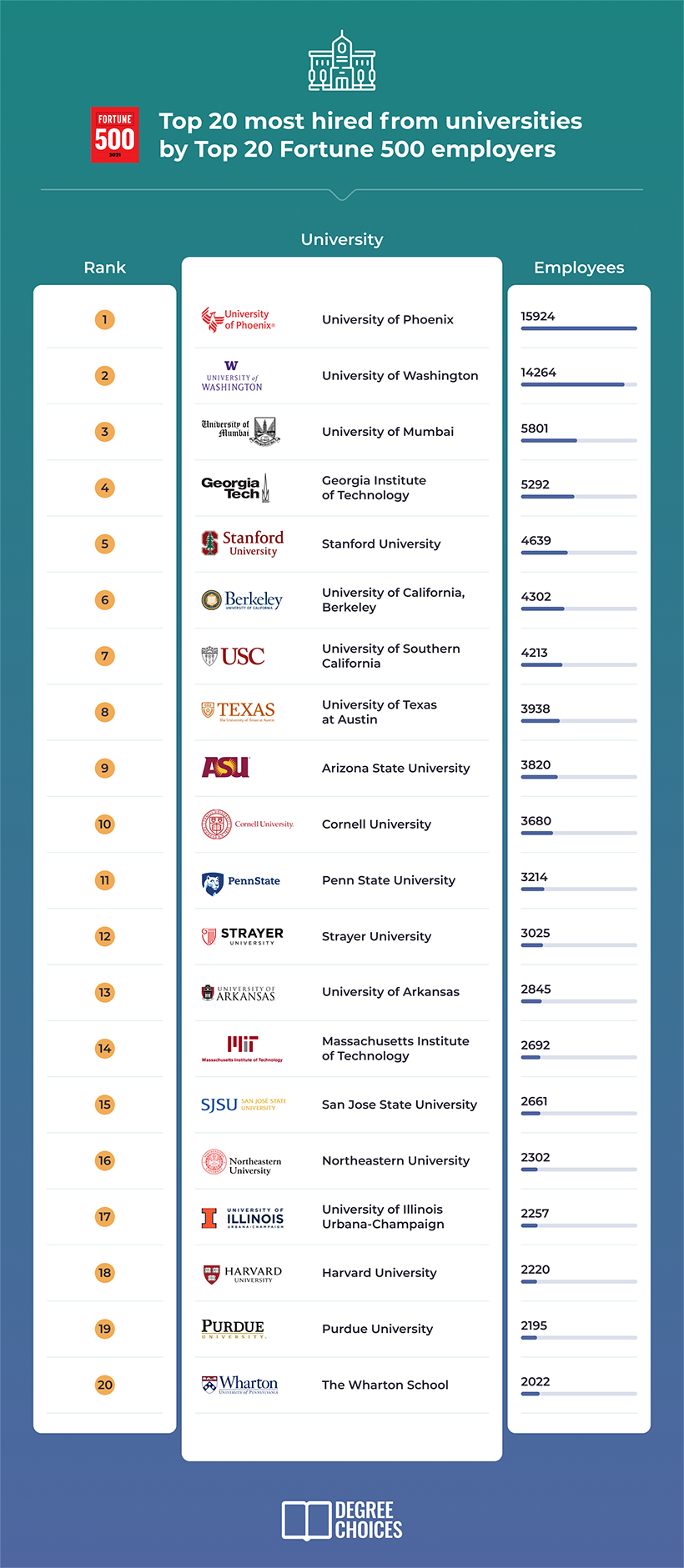 DegreeChoices网站根据LinkeIn网站中超过 150,000 个就业数据进行分析,最终确定了哪些大学和专业学位在美国财富 500 强公司中拥有最多的毕业生,以方便为学生提供参考。