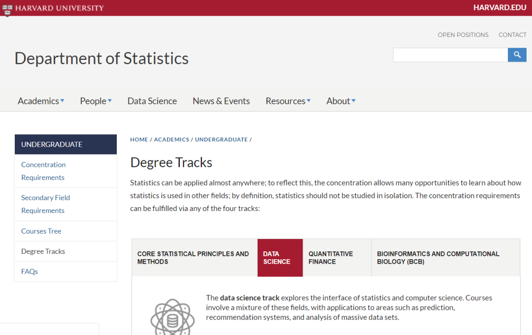 哈佛大学共有50个本科专业,开设近3,900门本科课程。专业属于跨学科的交叉性专业。而数据科学项目,它是哈佛大学统计学本科学位里的其中一个方向。