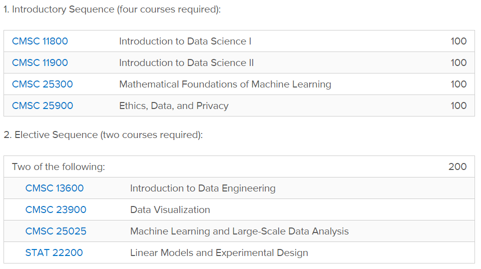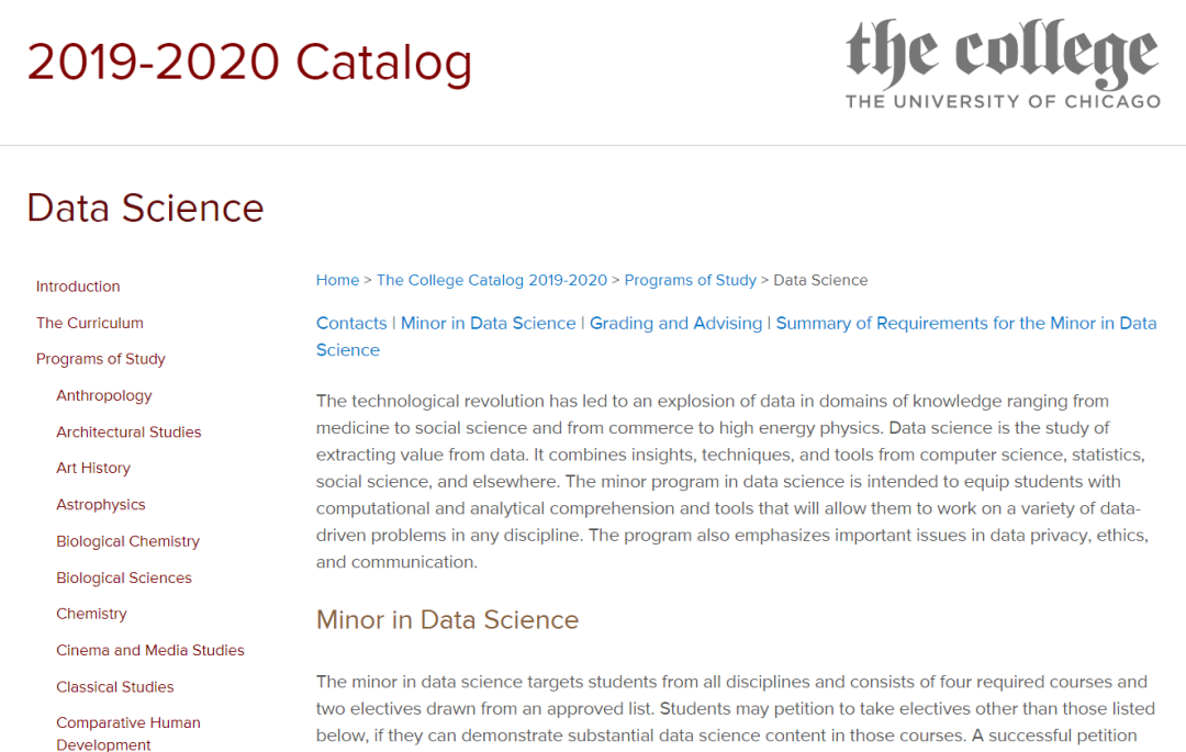 芝加哥大学的数据科学辅修课程针对所有学科的学生,课程包括了四门必修课和两门选修课。必修课包括数据科学导论i、数据科学导论ii、机器学习的数学基础、伦理、数据和隐私。