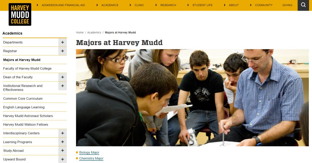 哈维穆德学院是美国一所专攻STEM的文理学院,该校只有七大专业:生物、化学、计算机科学、工程、数学、物理、数学及计算生物学。此外还有三个联合双专业项目。常见雇主是微软、Yelp、脸书、苹果和军工企业诺斯洛普·格鲁门公司等。录取率通常低于15%,难度直逼藤校。