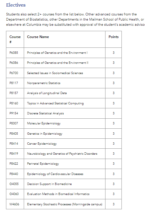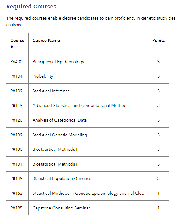 必修课程将使学位候选人能够熟练掌握遗传研究设计和分析。在极少数情况下,对于在该研究领域具有专业知识的学生,可以免除一两门必修课程;但是,学生仍必须至少完成 30 个学分才能获得 MS/SG 学位。如果学生不参加一门或多门必修课程,他/她可以选择在学生的指导老师批准下修读同一领域的更高级课程或生物统计学或其他学科的另一门选修课。