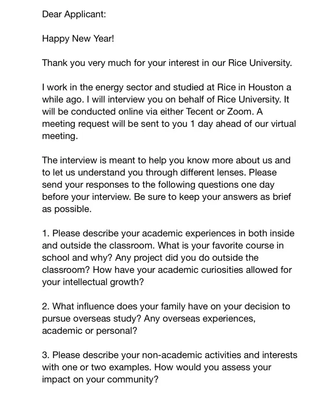 莱斯大学提供可选择的面试,由校友或者大四学生进行面试,将 通过腾讯或者Zoom线上进行面试。