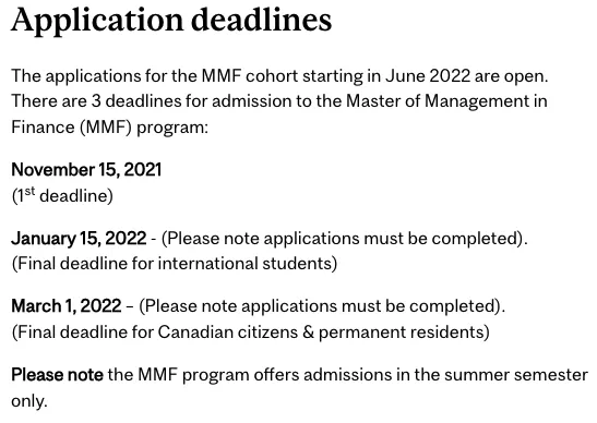 比如,加拿大麦吉尔大学MMF硕士项目有3个申请轮次,其中第三轮申请只提供给加拿大公民和永久居民,国际生须在第二轮完成最终申请。