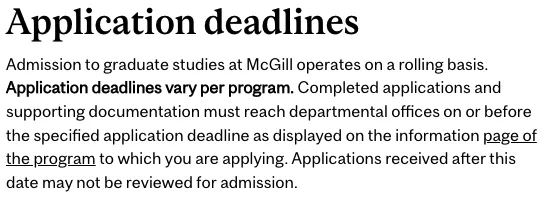 此种审理形式以英国和加拿大高校居多。加拿大麦吉尔大学在官网明确说明采用rolling滚动录取机制,具体l视不同项目而定。同时也建议国际生提前申请,不要赶在l的时候提交。