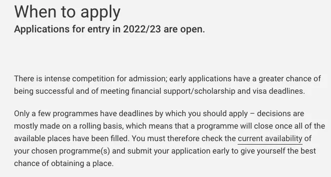 英国的审理方式基本均为rolling式,offer先到先得的概念在英研申请中最为明显, 网申开放后学校即按照申请者递交申请的顺序进行审理,招满即止。