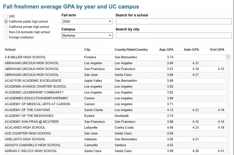 (https://www.universityofcalifornia.eu/infocenter/amissions-source-school),包括各个高中在加大每个分校的录取GPA: