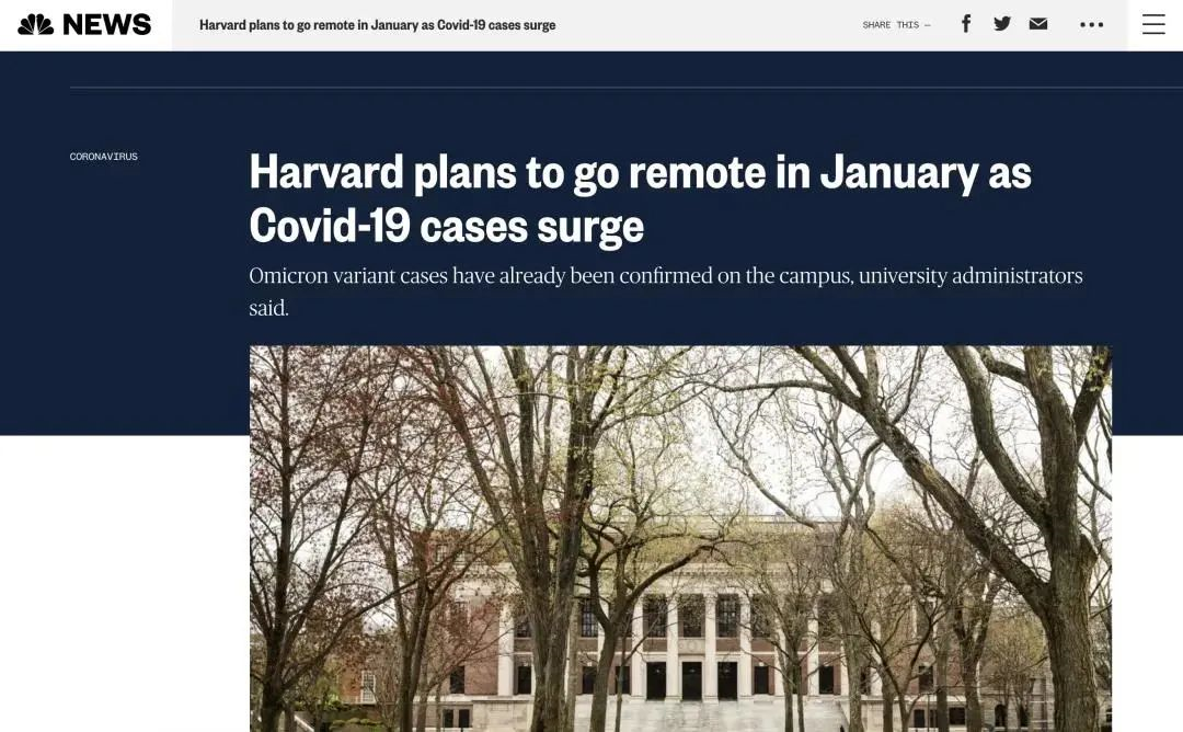 哈佛大学于近期通知所有学生与教工,学校将在一月前三周实行远程教学和办公,以降低校园内的人员密集程度,减少病毒传播风险。根据哈佛大学校历,2022年1月14日至1月23日是冬季寒假课程,春季学期课程定于1月24日开始,因此该政策对于学生的春季课程暂时不会造成太大的影响。