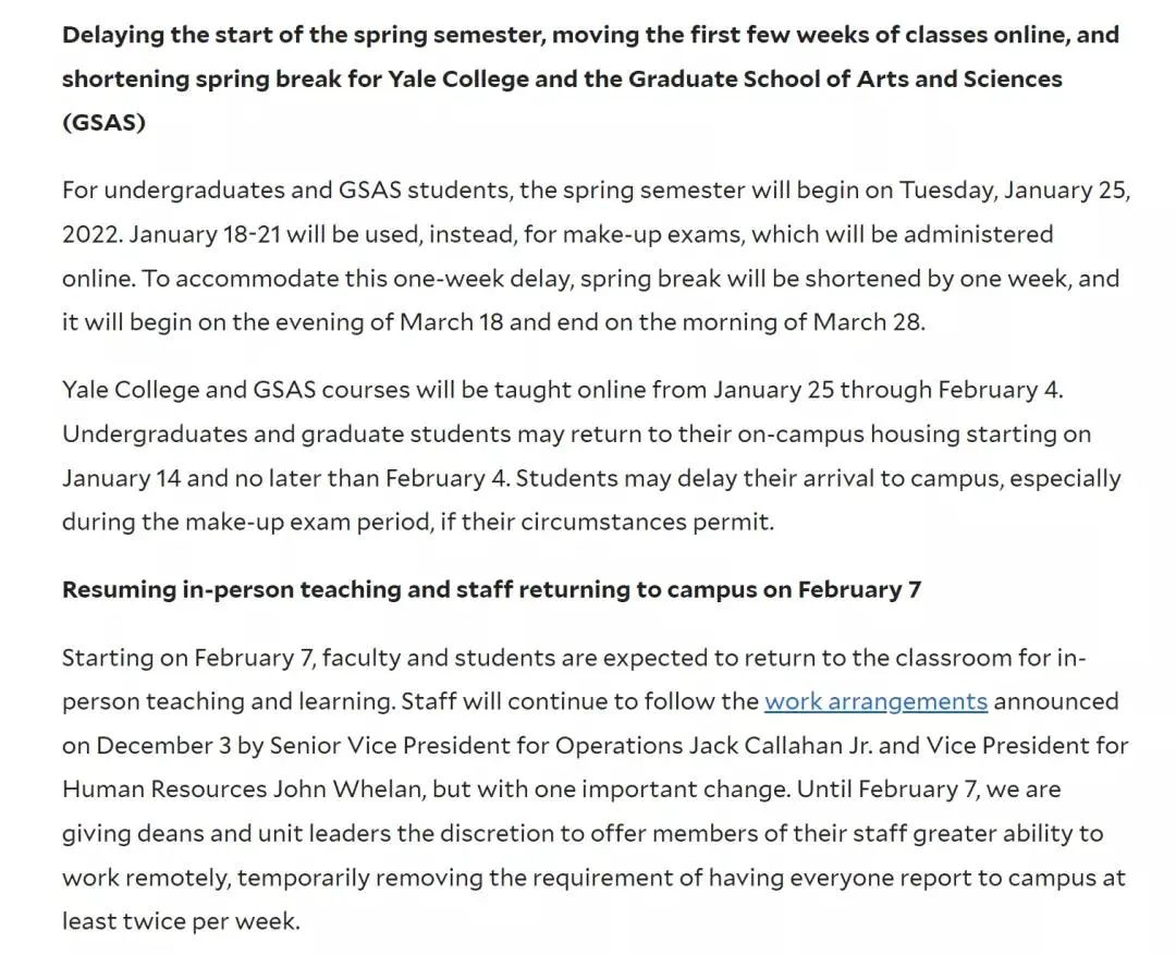上周耶鲁大学宣布推迟春季学期的开学时间至1月25日,春季学期的第一周1 月25日至2月4日,学校仍将采取线上授课。而为了弥补这一周的延迟,接下去的春假将相应地缩短一周。