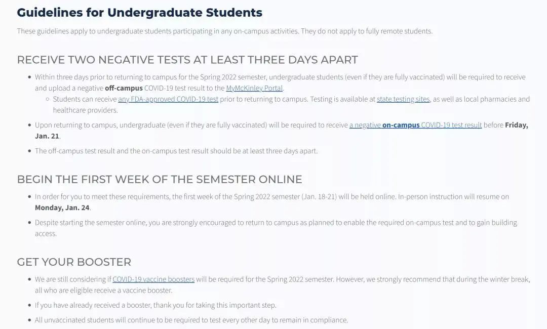 另外,学校要求所有在2022年春季学期注册的学生必须准备好已接受疫苗加强针注射的证明和返回校园前 48 小时内核酸检测阴性的报告。