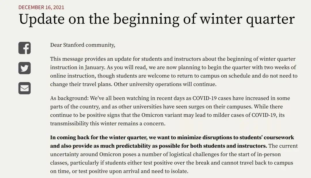 斯坦福大学是三学期制,对于接下来的冬季学期,学校表示开学时间不变,只是前两周将实行线上教学,从1月18日起恢复线下教学。