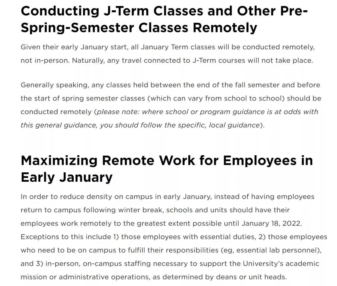 纽约大学宣布会先将1月学期和其他春季学期的前期课程挪到线上,不允许开展任何线下教学。另外,学校也会尽可能地让教职工在1月上旬进行远程办公,以保护他们的身体健康。