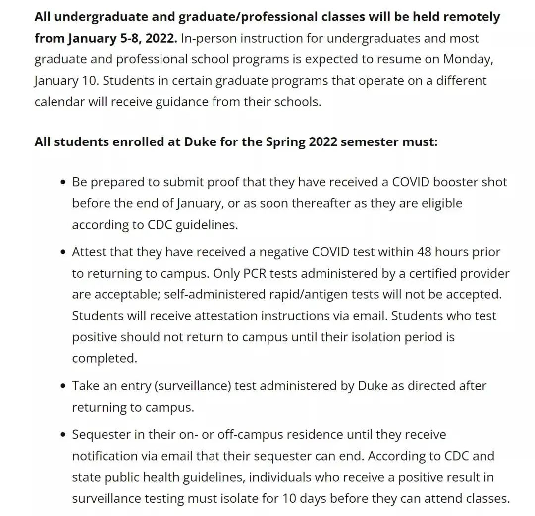 杜克大学于上周正式确认所有本科生和研究生的春季课程都将先以远程的形式开始,从1月5日持续到1月8日,线下面对面的教学预计将于1月10日起恢复。
