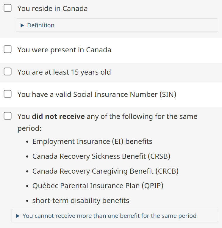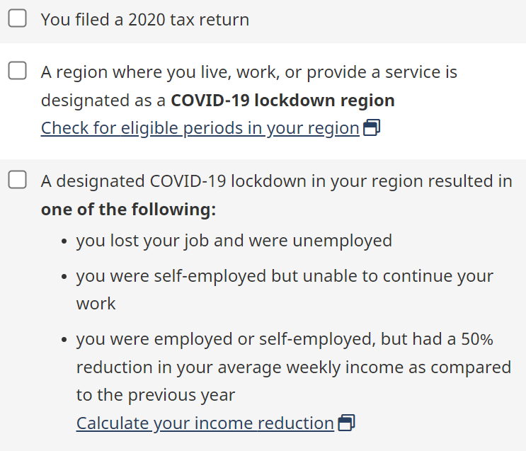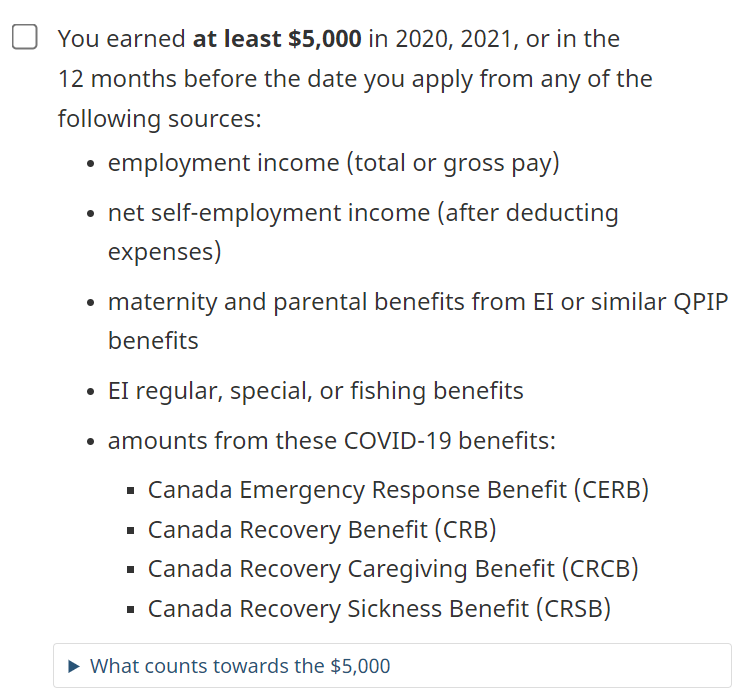 3,至少在2020年、2021年或申领前的12个月里,有过至少$5000加币的收入,包括雇佣收入、自雇净收入、来自EI或QPIP的产假福利、EI福利,以及其他疫情福利(CERB/CRB/CRCB/CRSB)。