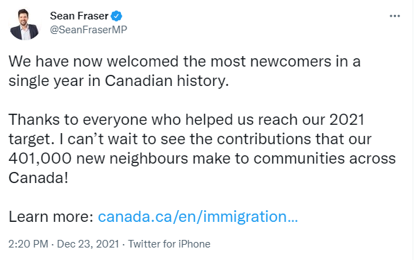 2021年12月23日,加拿大移民部长肖恩·弗雷泽迫不及待的宣布了一个值得载入史册的消息: