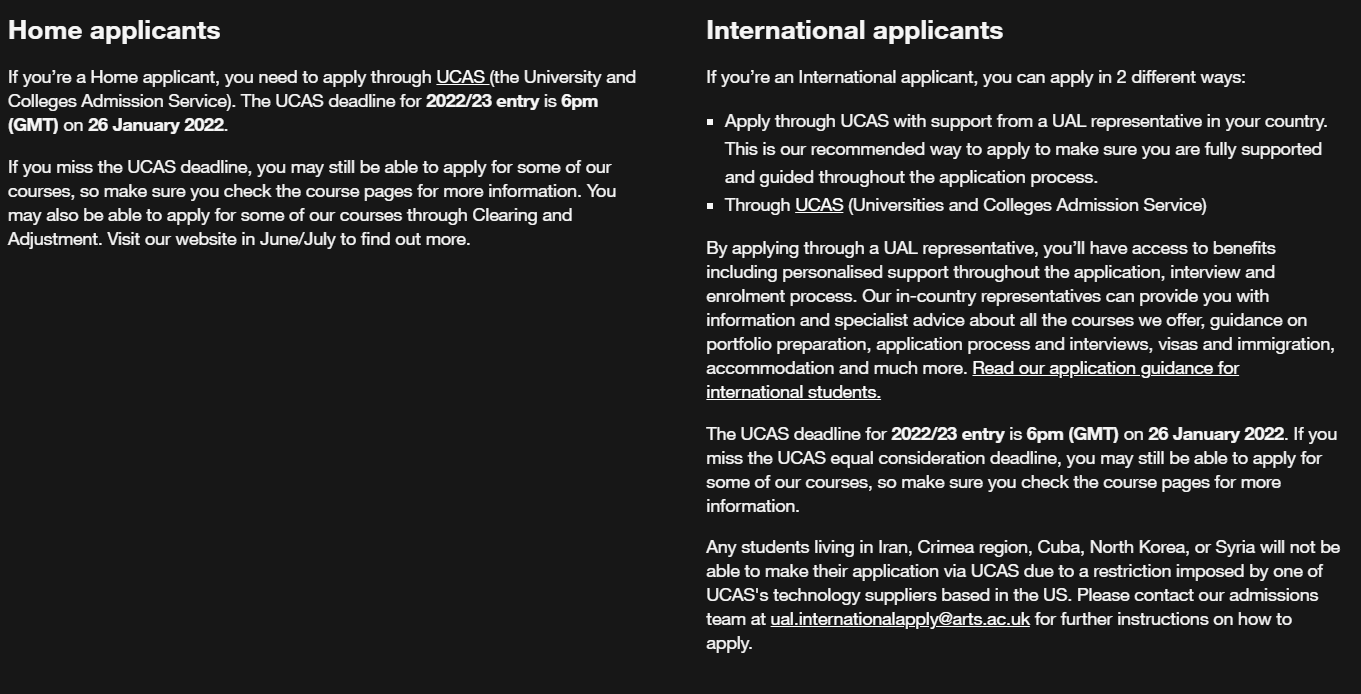 从去年之前,都可以直接从UAL官网申请UAL的本科,但是从今年开始,必须通过UCAS。