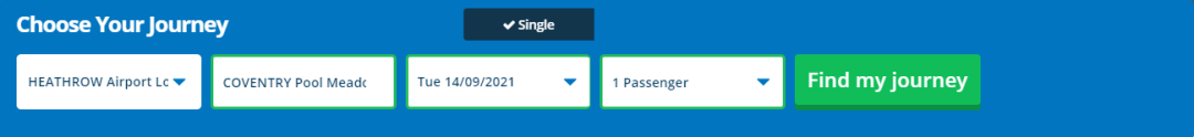 Step 1: 在预订页面选择到达机场、到达时间和乘客人数(1位),点击Fin my journey查询行程。
