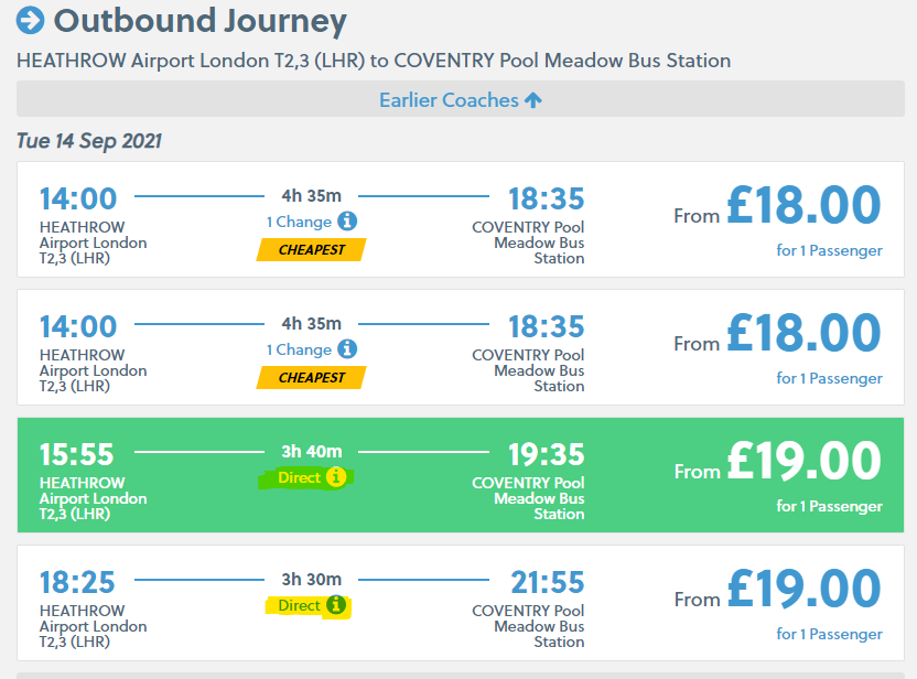 注:请尽量选择直达(Direct)行程,如图中黄色区域高亮所示,确保从机场到考文垂大巴站无需换乘。