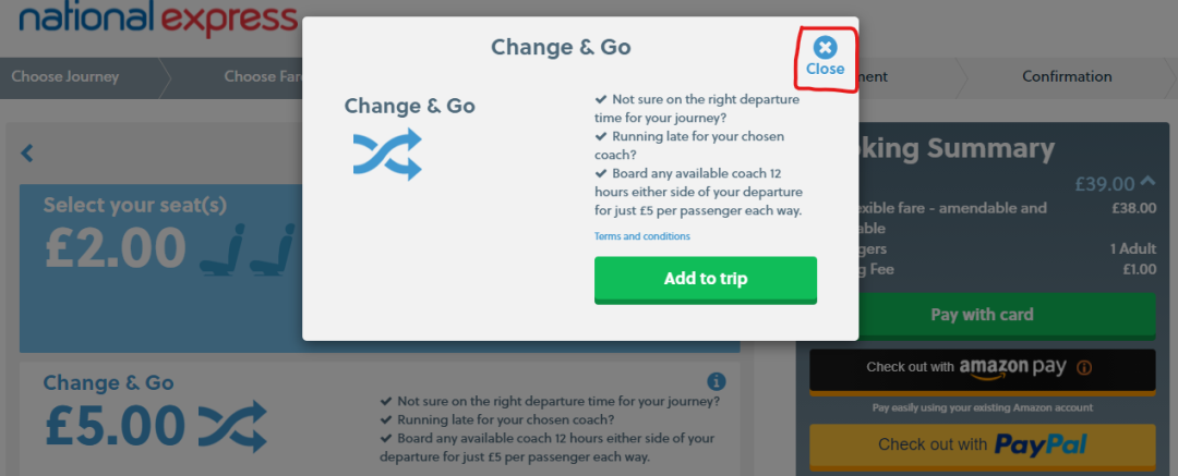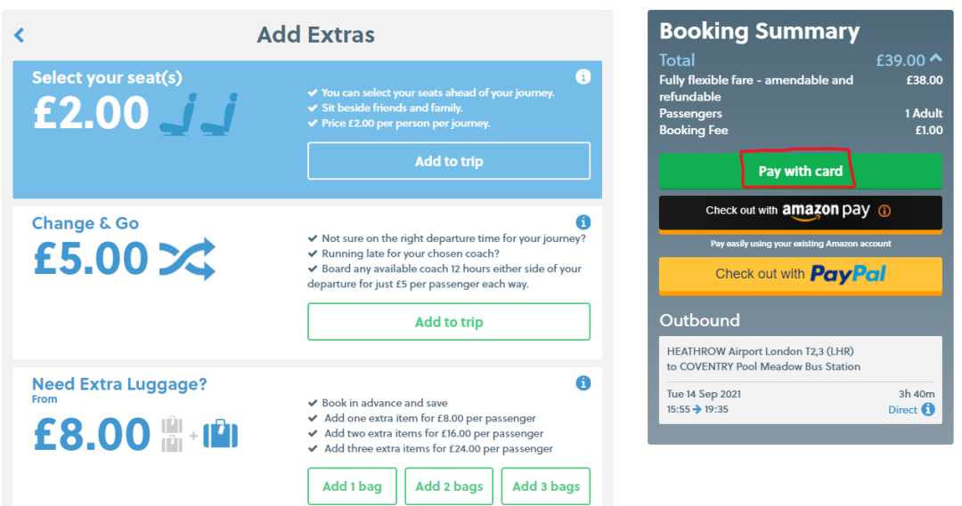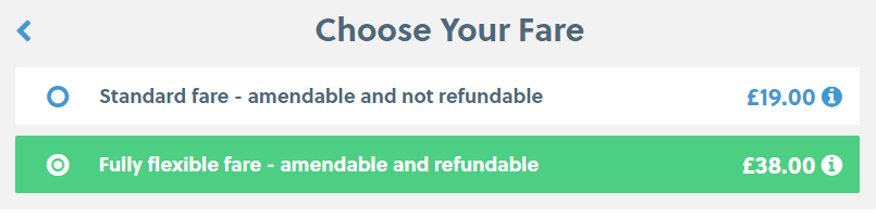 Step 3: 选择车票类型。请选择Fully flexible fare以确保在遇到航班延误而错过预订大巴时,车票可以改签。点击Continue确认车票并进入支付页面。