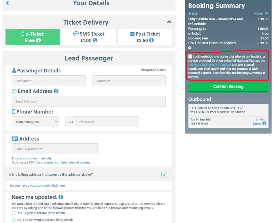 Step 6: 输入个人信息,包括姓名、邮箱、联系电话、住址等。选择是否愿意接收 National Express 广告邮件、检查车票信息、阅读订票条款(红色区域内的链接)并勾选同意后,即可点击Confirm Booking确认预订。