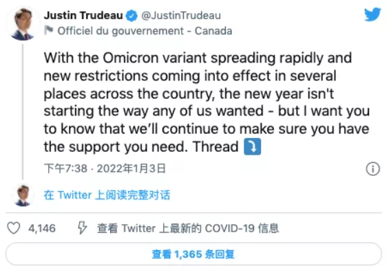 1月3日,加拿大总理特鲁多在推特上简要介绍了加拿大人可以从联邦政府获得的支持,包括新的加拿大工人封锁福利。特鲁多表示:“要知道,我们将继续支持你们、你们的家人和你们的企业服务。”