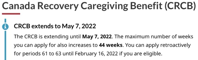 该福利对受雇人士和自雇人士开放。你和你的家庭每周可以收到 $500元,税后 $450元的费用。CRCB 将延长至 2022年5月7日。你可以申请的最长周数也增加到 44周。如果你因为生病而不能工作,或因为新冠疫情需要自我隔离,加拿大康复疾病津贴(简称:CRSB)是可用的。每周你可以得到 $500元,税后 $450元的费用。网址:https://www.canaa.ca/en/revenue-agency/services/benefits/recovery-sickness-benefit.html