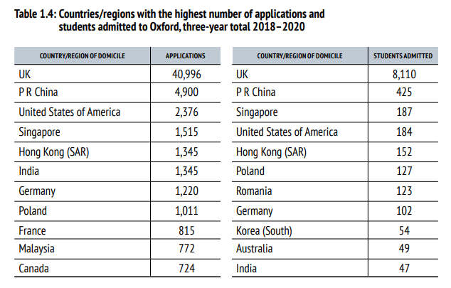 中国大陆是牛津申请人数最多、录取人数最多的留学生来源地。