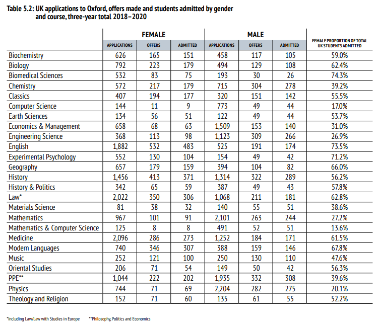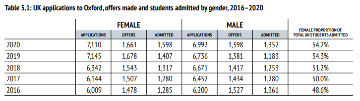 过去的五个申请季,牛津大学录取的女性英国本土学生比例呈上升趋势,从2018年开始,女生多于男生。