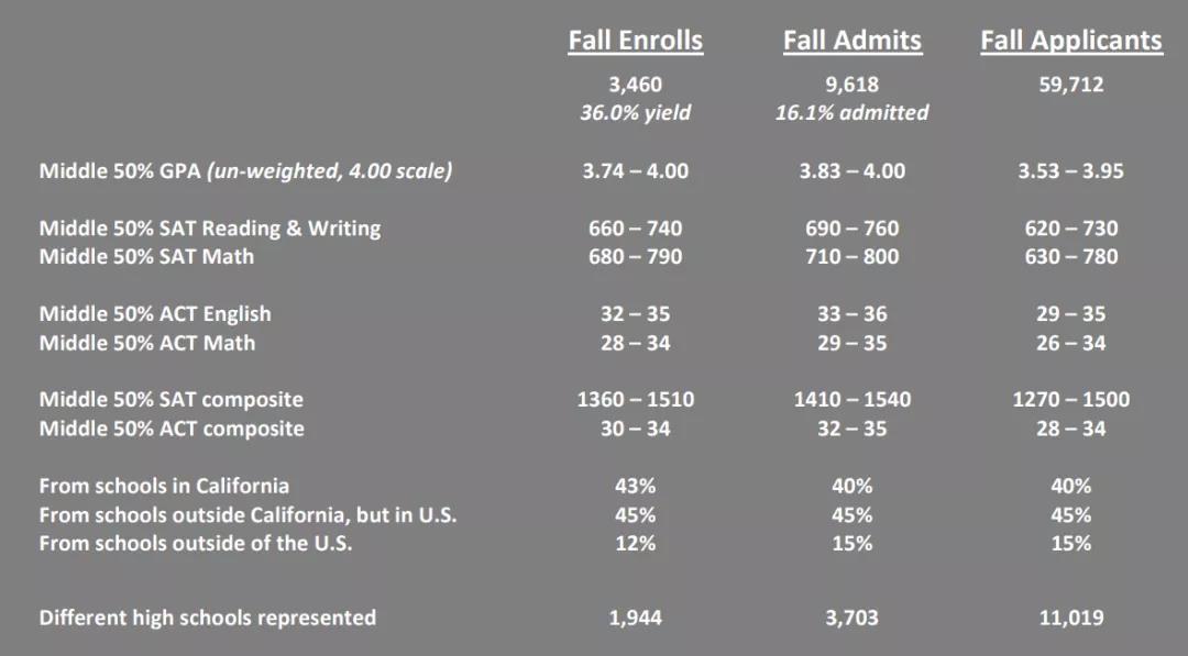 USC 去年总体录取率为 16.1%,国际生比例 15%。录取学生平均 GPA 3.83-4.0,SAT 均分 1410-1540,ACT 均分 32-35。