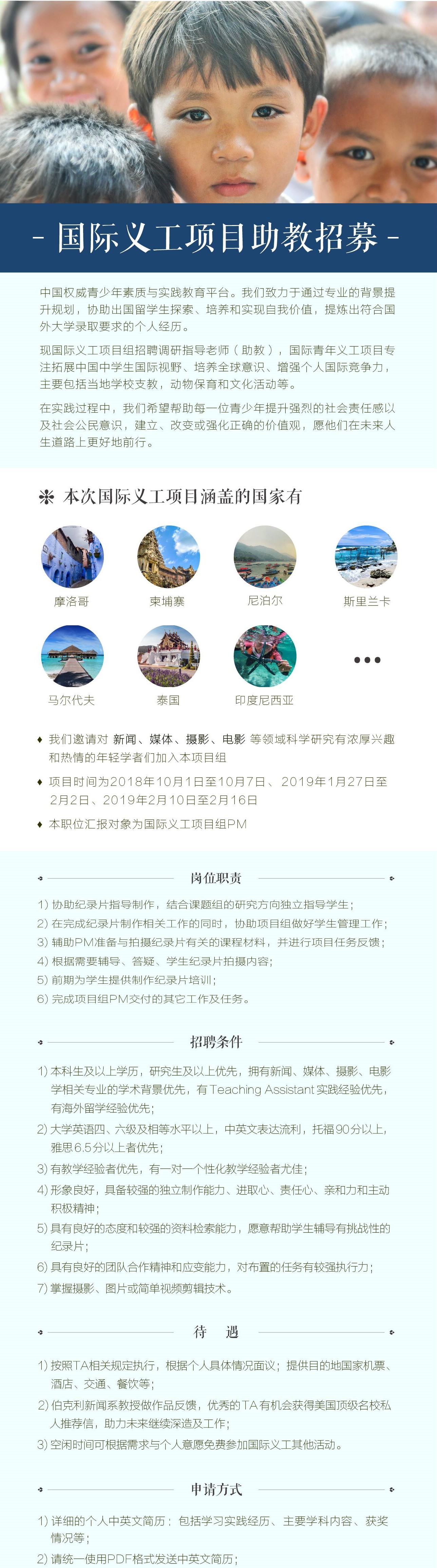 现国际义工项目组招聘调研指导老师(助教),国际青年义工项目专注拓展中国血色和国内国际视野,培养全球意识,增强个人国际竞争力,主要包括当地学校支教,动物保育和文化活动等。在实践过程中,我们希望帮助每一位青少年提升强烈的社会责任感以及社会公民意识,建立、改变或强化正确的价值观,愿他们在未来人生道路上更好地前行。