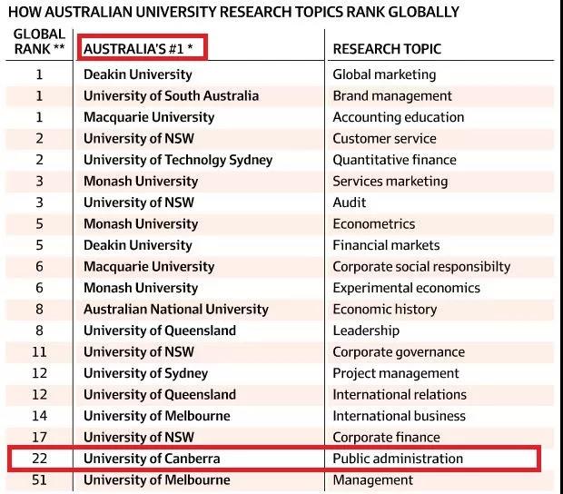 据《澳洲金融评论》(Australian Financial Review,AFR)最新报道,堪培拉大学的 公共管理 (Public Aministration) 学科科研排名位列 全澳第一,全世界第22!