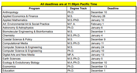 在线申请于 10 月 1 日开始提供(除非另有说明),并于计划截止日期当天太平洋标准时间晚上 11:59 截止。入学 仅限秋季 学期,没有全年入学。