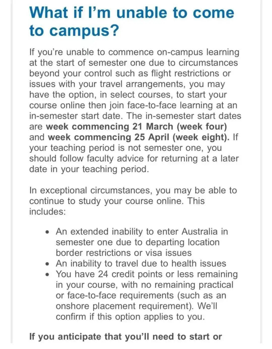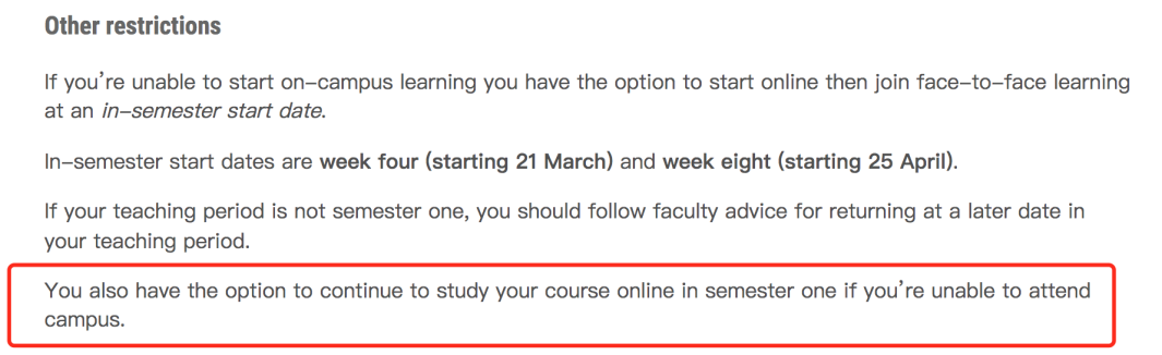 如果你不能在开学之前回到澳洲,那也可以选择先上网课,从第四周(3月21日开始)或者第八周(4月25日开始)的时候,再入校开始上线下课程。