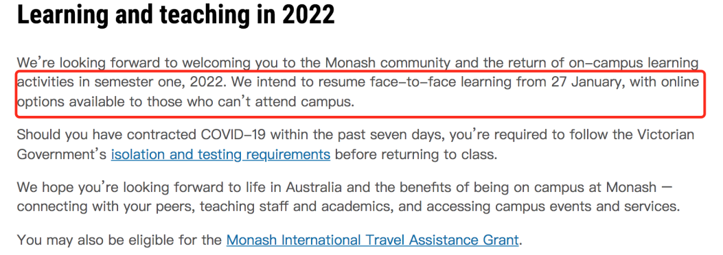 根据莫纳什最新的教学安排,可以看到,莫纳什大学会从1月27日开始恢复线下课程教学,不能到校的学生可以选择上网课。