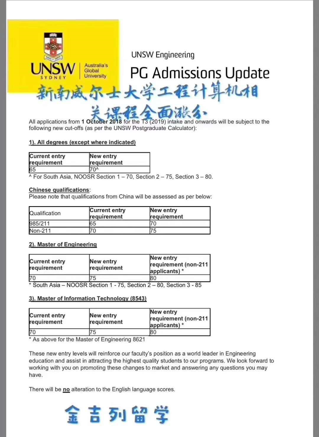 新南威尔士大学工程计算机相关课程2018年10月1号开始涨分 65% = 72 70% = 76 75% = 80 80% = 84 开学之后尽快提供材料来申请吧 所有涨分通知中新南此次算是最仁慈的了,给足了一个多月时间来应对变化!