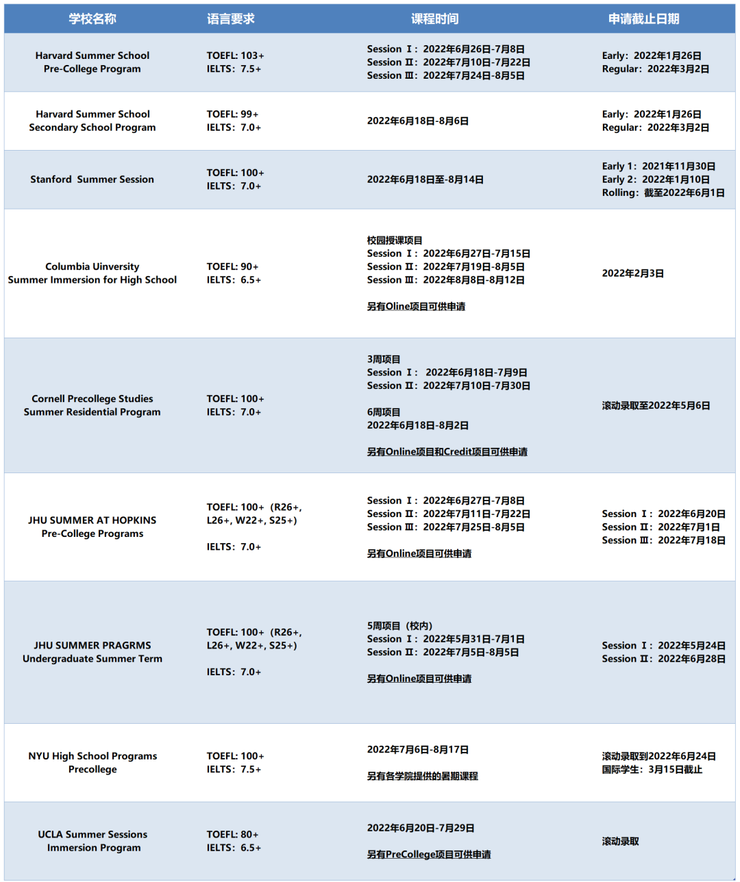 美国大学或高等教育机构一般在6-8月开设暑期课程,申请时间集中在12月~3月,大多数夏校的申请截止日期在2月初,少部分会在1月中下旬截止,也有个别项目在1月初停止招生,因此建议在规划活动的同学们提早关注夏校。4月、5月截止或者滚动录取的项目,也建议早点递交申请,避免位置满额。