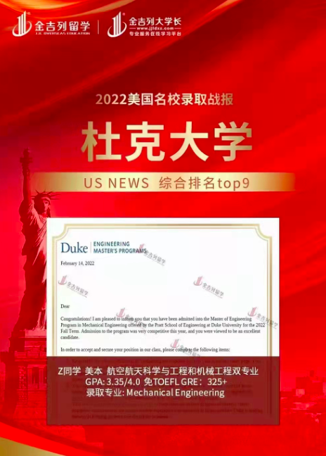 恭喜Z同学,收到了排名第九的杜克大学机械工程硕士的offer!