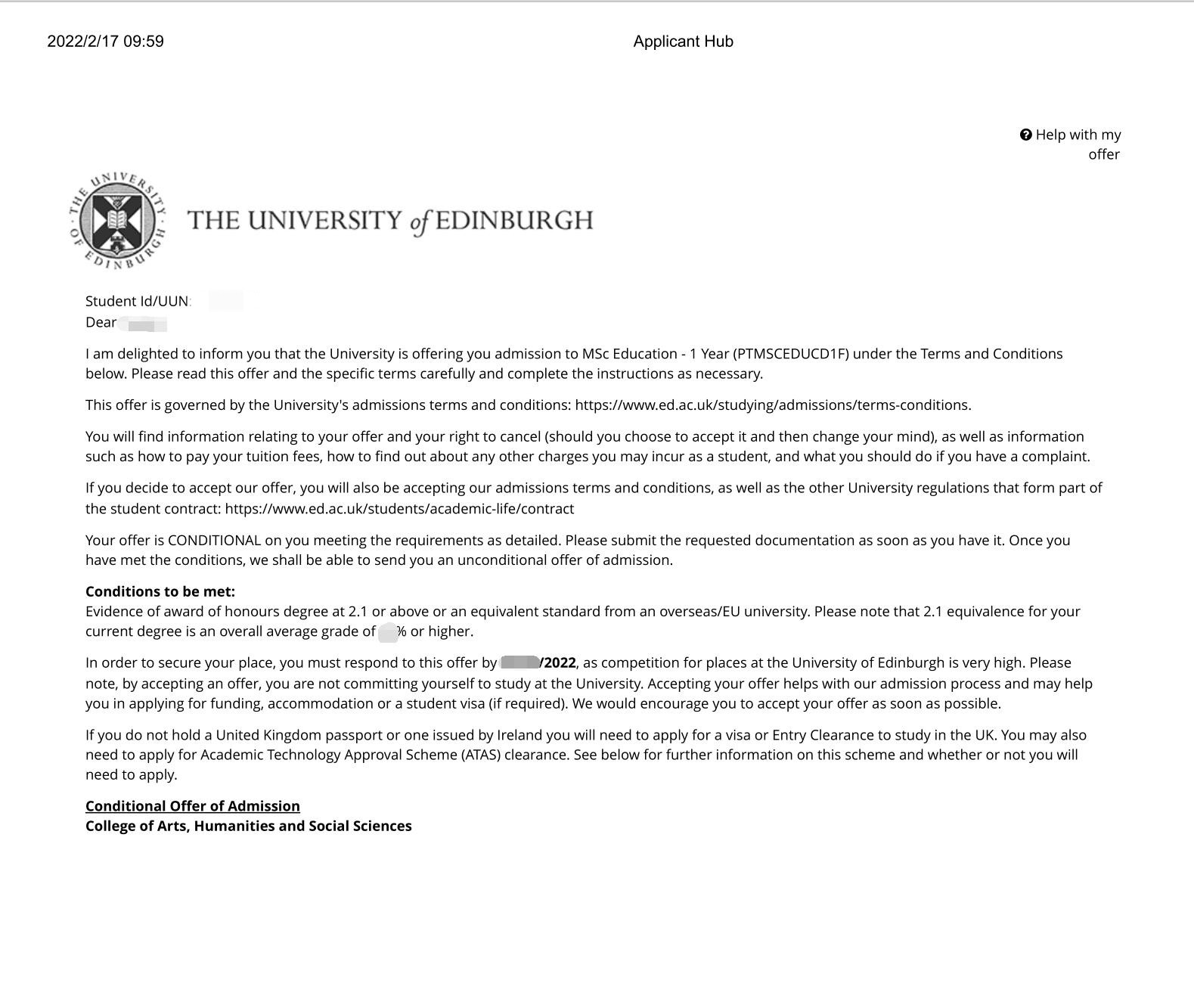 在帮学生择校时,除了选择专业名称叫教育心理学,也选择了教育学,因为英国很多大学的教育学专业有青少年心理学分支,这也是学生非常感兴趣的专业方向。经历了3个多月的审理期的等待,今天终于迎来了世界Top16名校爱丁堡大学的offer。