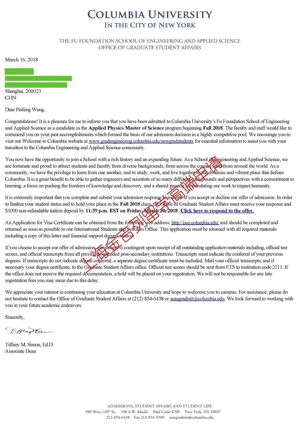 录取结果 :哥伦比亚大学美国留学季老师成功案例