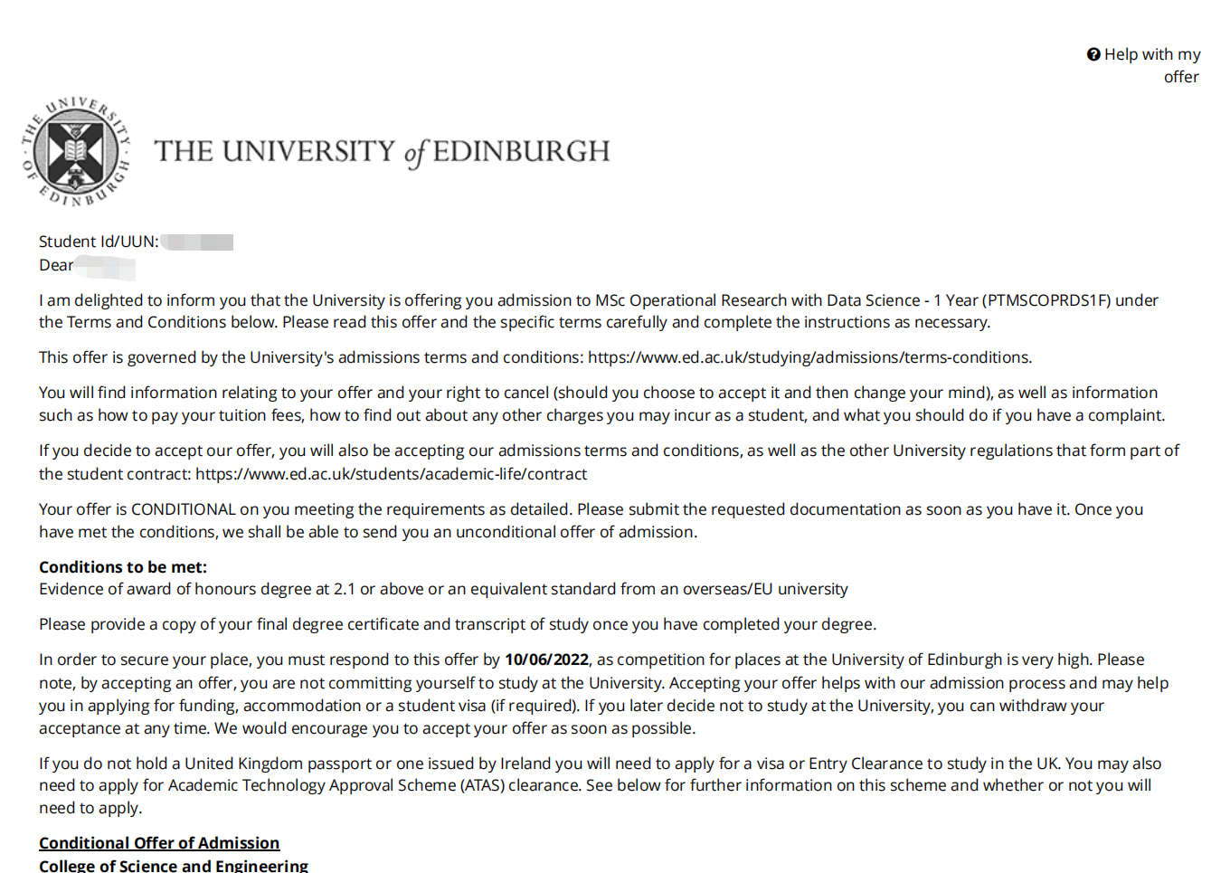 学生国内华南理工大学985机械工程+爱大 2+2,找到金吉列留学黄老师已经很晚了,材料迟迟未开出,因爱大成绩不太理想,还有挂科,多次想着要放弃申请,在老师的鼓励下,我们协商一起争取申请,不试就没有结果,3月递交申请,5月录取~