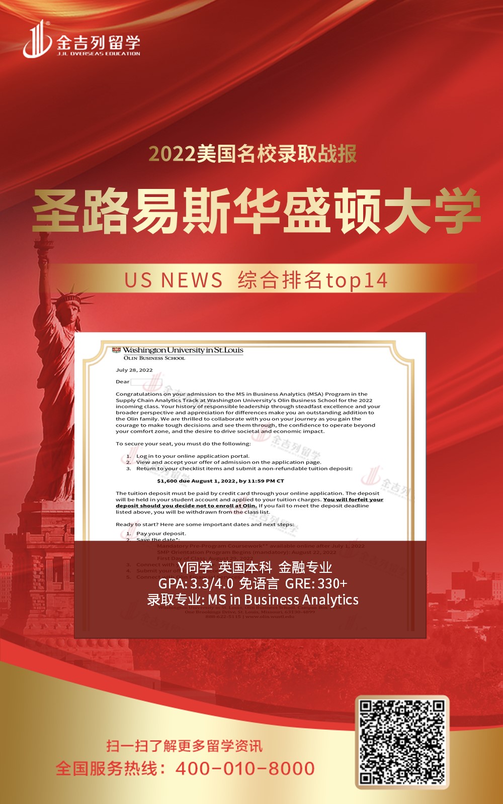 录取院校:圣路易斯华盛顿大学(USNEWS 综合排名TOP14)