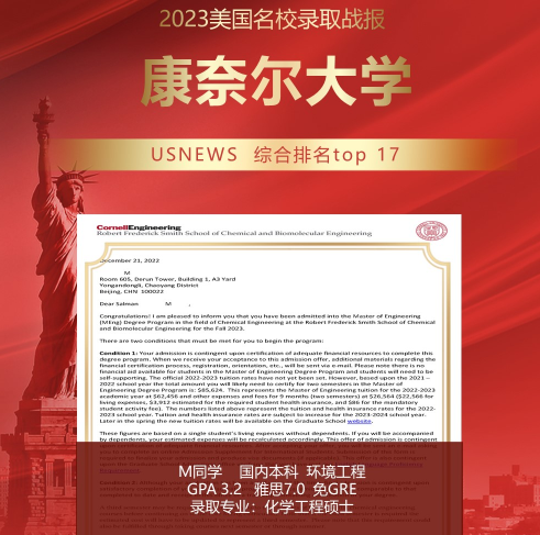 录取结果:康奈尔大学(全美17)化学工程硕士