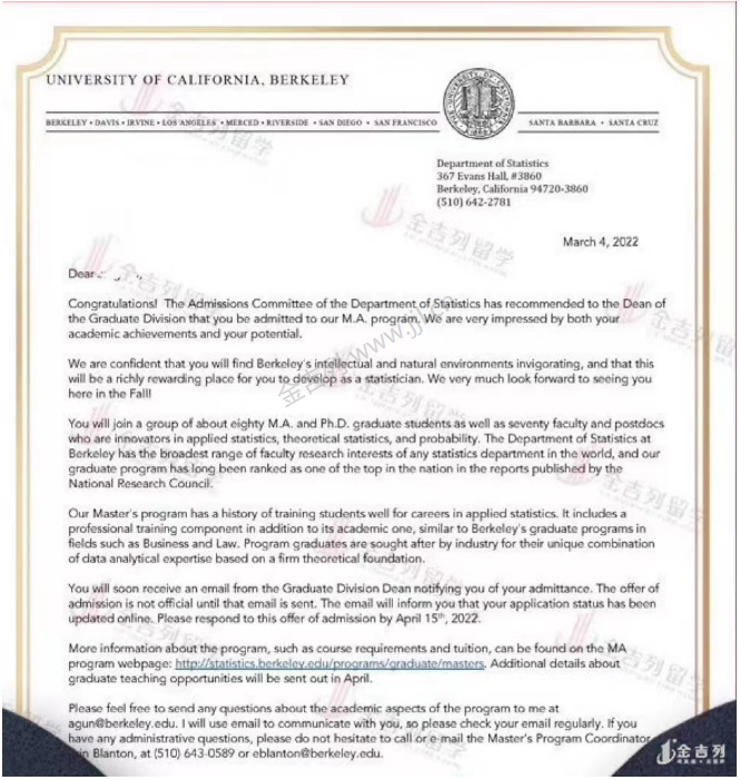 录取专业:Master of Arts in Statistics 统计学硕士录
