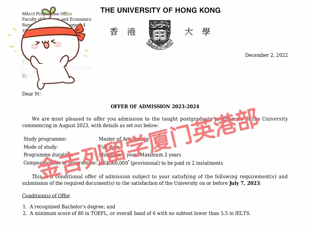 申请解析:学生院校背景较好,有7.0的雅思,也考了GMAT。学生在申请期间配合度高。 不过因为同时在准备考研等事宜,考了一次GMAT以后,没有时间再刷分,一般申请港前三的商科,建议GMAT最好有700+会更好些,但因为考研准备时间紧,没能再安排时间刷分,就以当下的成绩进行申请递交。港大的商科是9月份开放,一开放申请,我们就第一时间进行了申请的递交,并在各个时间节点和申请细节中把控,提前预约匹配资深文书老师。学生虽然雅思总分较高,但口语薄弱,在拿到港大录取前,也拿到了多个学校的面试邀请,但因口语薄弱没有信息,根据学生情况提前安排面试辅导后,学生陆续拿到多个录取,并在11.14日拿到港大的预录取,12.2日拿到正式录取,并安排时间缴纳押金,安心准备后续入学事宜。