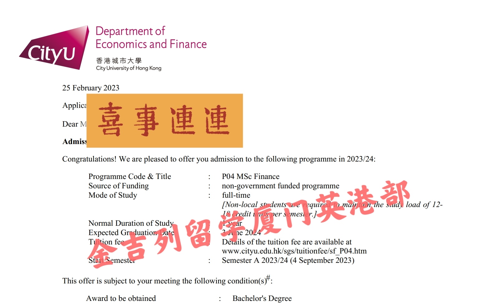 申请解析:学生一直都是远程沟通,未见面选择委托我们办理留学事宜。学生院校背景较好,均分不突出,无GMAT。本来要准备考GMAT,但因为GMAT的考试一直被取消,最后放弃考GMAT。推荐信也因为各种原因,一直没有找到合适的推荐人,最后在12月份的时候,决定不再等待推荐老师的回复,直接递交申请,因为推荐信的限制,先递交了城市和理工。最终2月份收到了理工的笔面试,并在过了一周后,拿到了城市金融专业的录取,在今年香港这么卷的情况下,拿到热门金融专业的录取,真的是特别激动。希望同学们都能把握时间,尽早递交申请,根据自身不同情况,掌握时间截点,不要因为碰到困难就止步不前。