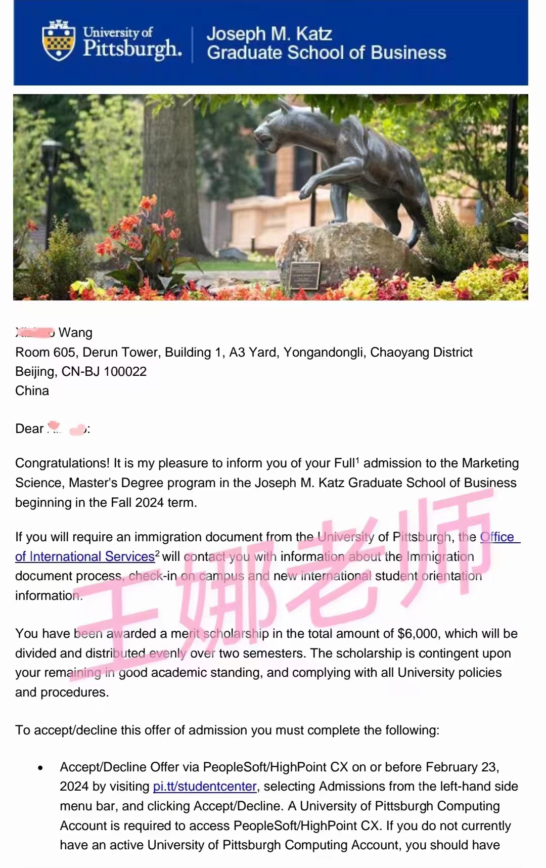 小王童鞋喜提世界排名45位匹兹堡大学录取,且获得6000美金奖学金