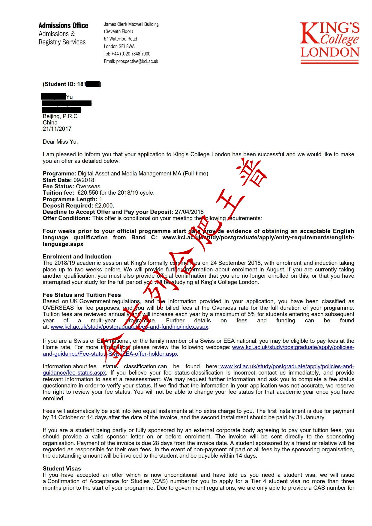 录取结果 : 伦敦大学国王学院 谢菲尔德 诺丁汉