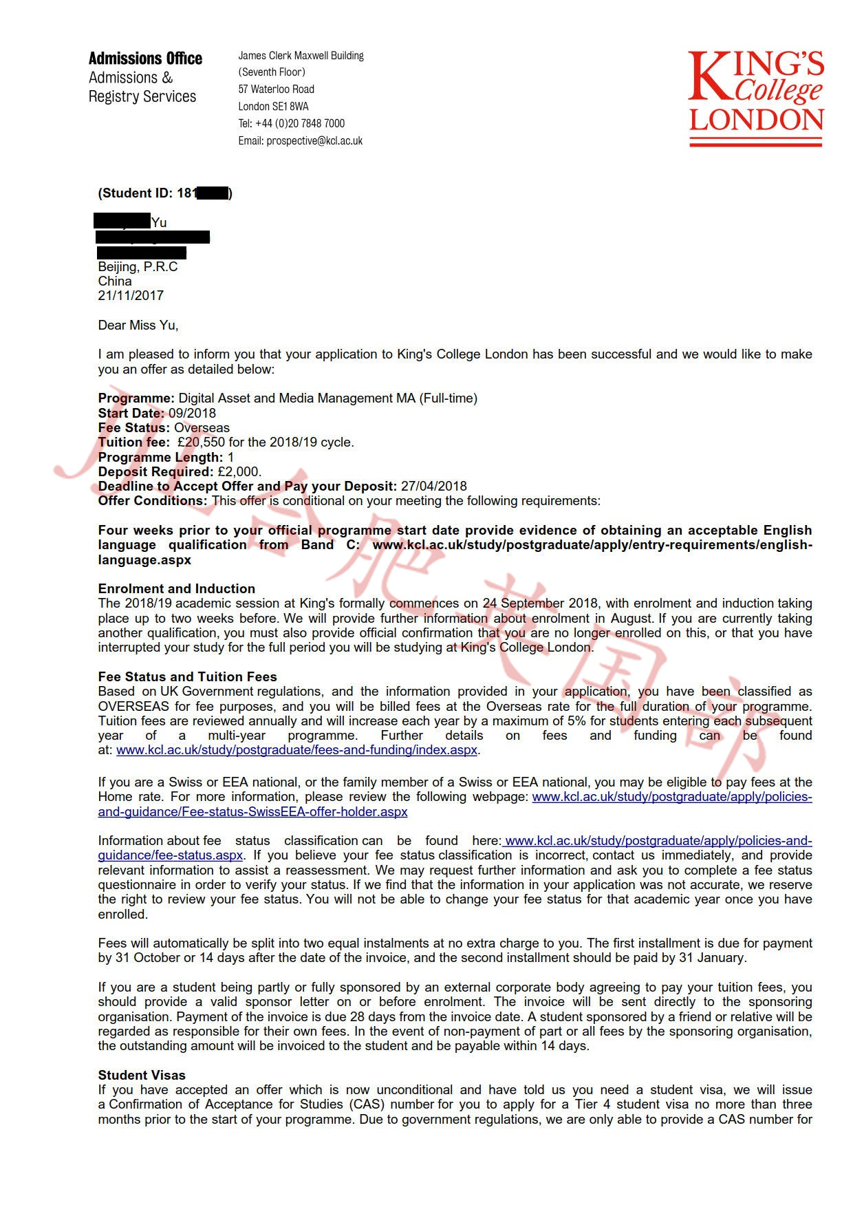 录取院校 :伦敦大学国王学院、谢菲尔德大学、诺丁汉大学
